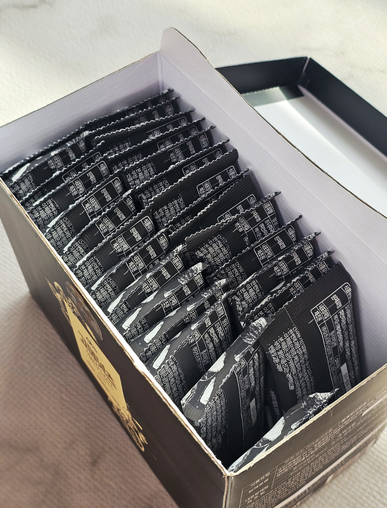 패키지가 블랙과 골드를 사용하여 고급스럽습니다.